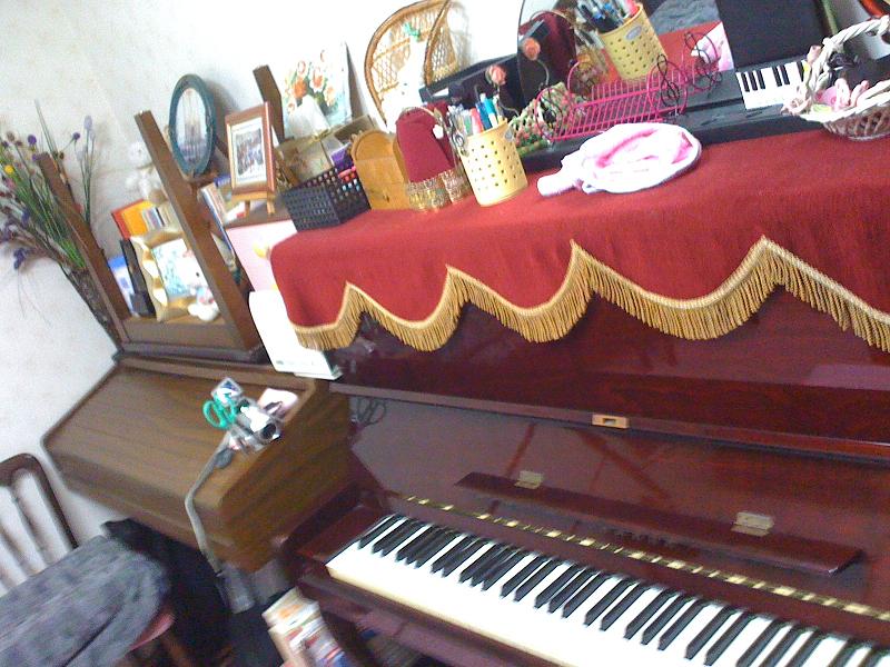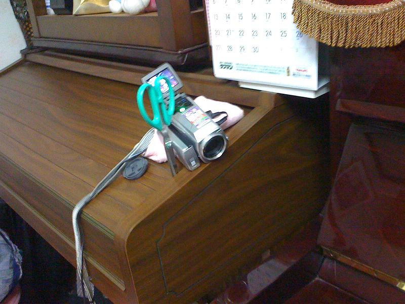 ええと、ピアノの隣にオルガン(2、3年誰も使っていない)があるんですが、その端っこにカメラを置き、滑り落ちないようにハサミを隙間に差し込んで、視点を下げるために下にクッションを敷いています。